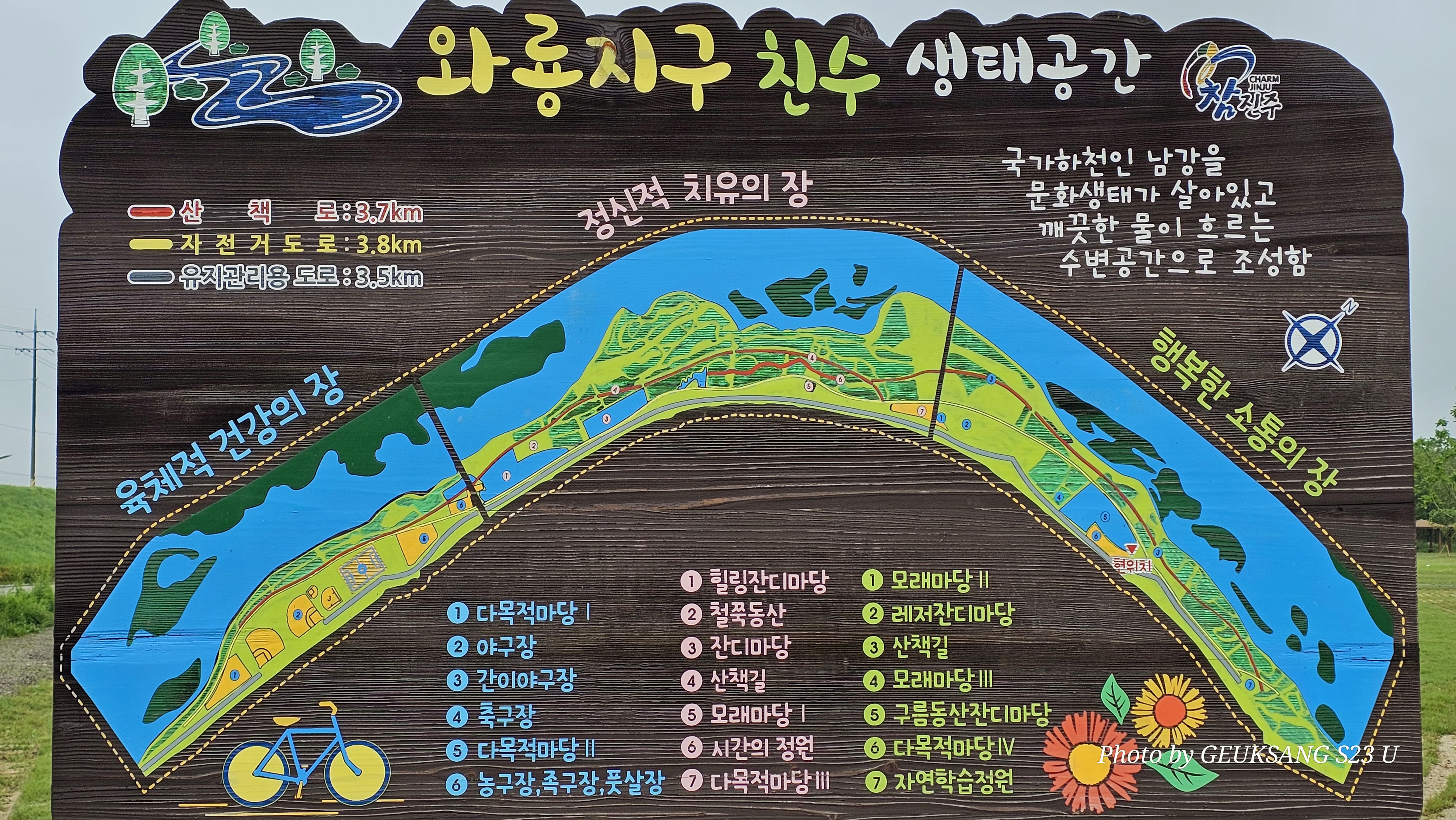 [2024,05,12 06:20~09:00 Ph GS23U 1,795(14)] 경남 진주시 금산면 송백리 656 금산송백테마공원 주차장 ~ 금산교 ~ 금빛나래길 와룡지구 친수 생태공원 야구장 축구장 풋살구장 ~ 대숲길 ~ 캠핑장(다목적마당) ~ 끄티공원(4,3km) ~ 자전거도로 차도 ~ 송백테마공원 주차장(5,1km) - 9,1km